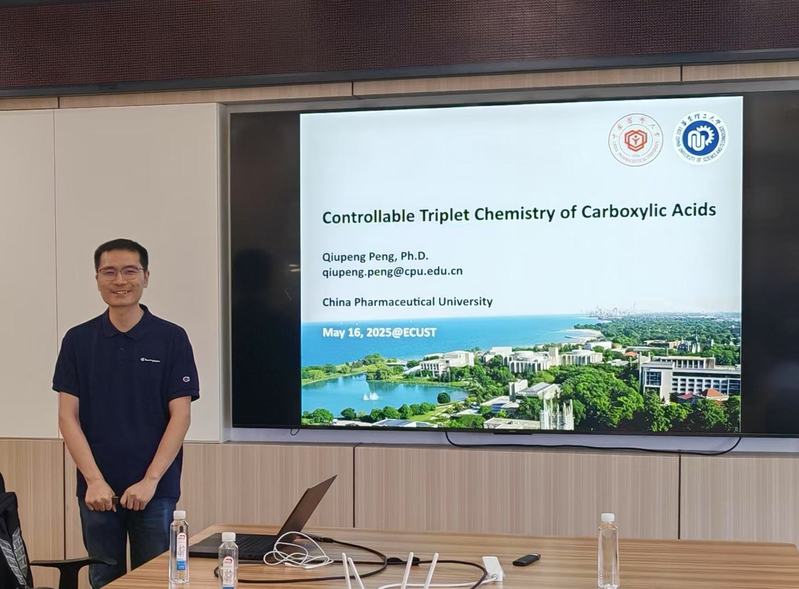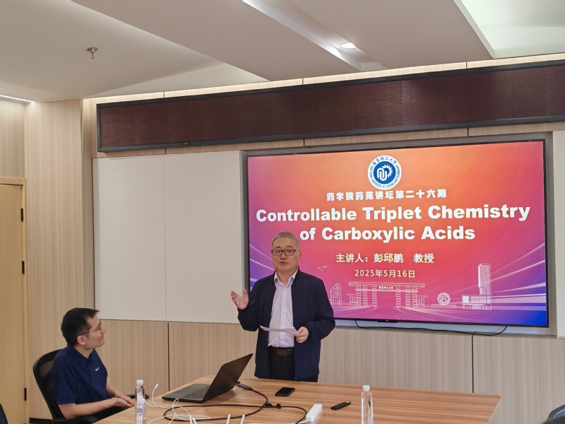 5月16日下午,3522vip浦京集团官网第二十六期“药苑讲坛”在实验十八楼418会议室举行,本期讲坛邀请到了我院校友、中国药科大学彭邱鹏教授,为师生们带来了一场题为《Controllable Triplet Chemistry of Carboxylic Acids》的学术报告。报告会由3522vip浦京集团官网副院长马磊主持,制药工程系副主任郑军等学院相关研究领域的师生参加。